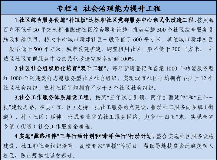健全城乡社区治理机制。健全完善“党建引领+综合服务+综治保障+科技赋能”社区治理新框架,创新稳定投入、权责对等、资源整合、内生动力、人才培养、共建共享“六大机制”,探索城乡社区治理新理念、新机制、新模式、新场景。出台城乡社区工作事项准入制度指导意见,推进城乡社区事项依法准入和动态管理。推动社区治理供需对接,优化社区资源配置,推进社区服务项目化。探索建立社区服务质量认证机制,推进社区服务标准化。完善社会力量参与社区治理的激励政策,创新社区与社会组织、社会工作者、社区志愿者、社会慈善资源的“五社”联动机制。鼓励有条件的地方通过企业和社会组织捐赠等方式设立社区治理发展基金,完善居民投入精神荣誉褒奖嘉许制度,增强社区“造血”功能。推进社区工作者专业化职业化,构建全周期职业化社区人才体系。实施城乡社区治理“试点示范行动计划”,命名一批基层治理示范街道、基层治理示范社区。