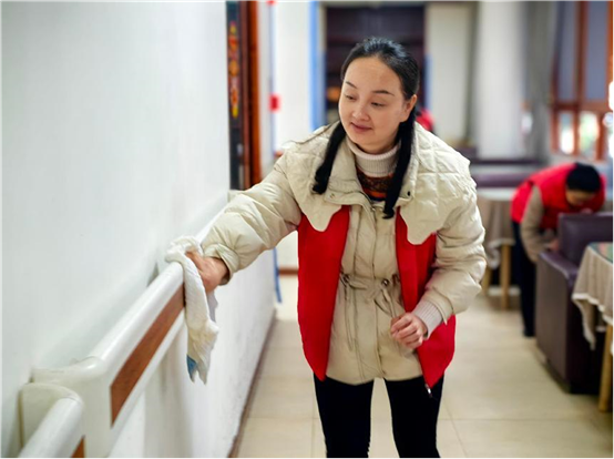 “净居守护队” 则将精力投入到改善养老中心环境上。他们手持扫帚、抹布等清洁工具,有条不紊地对公共区域展开全面清扫。门窗上的污渍,被志愿者们蘸着清洁剂的抹布反复擦拭,逐渐变得透亮洁净。桌椅被摆放整齐后,细心清扫、去灰层,恢复了原本的光泽。经过一上午的努力,养老中心变得窗明几净,环境更加舒适。