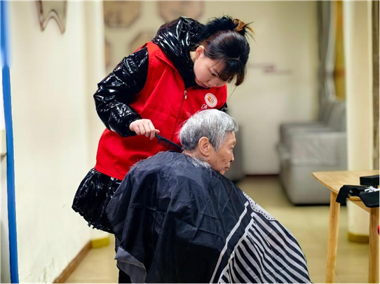 “银丝焕彩队”承担起为老人打造崭新形象的重任。志愿者们抵达现场便迅速摆好理发工具,热情邀请老人入座,为他们免费提供理发服务。面对每一位老人,他们都耐心询问对发型的喜好与需求,从发长到层次,从刘海造型到整体风格,无一遗漏。在理发过程中,志愿者们手法娴熟,剪刀开合间,精准修剪每一缕“银丝”,推子轻移,塑造出利落轮廓。不一会儿,原本凌乱的头发变得整齐有型,老人们瞬间容光焕发,对着镜子露出满意笑容,纷纷为志愿者的手艺点赞。