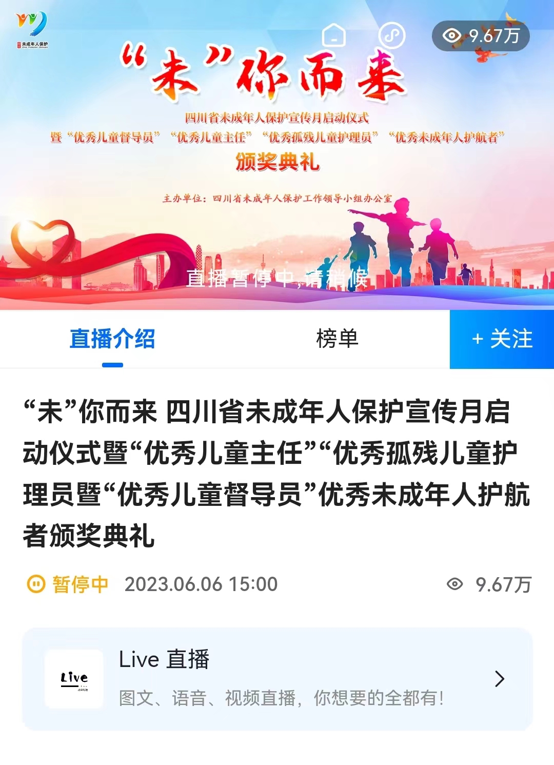 四川省未成年人保护宣传月启动仪式暨“优秀儿童督导员”“优秀儿童主任”“优秀孤残儿童护理员”“优秀未成年人护航者”颁奖典礼视频直播页面