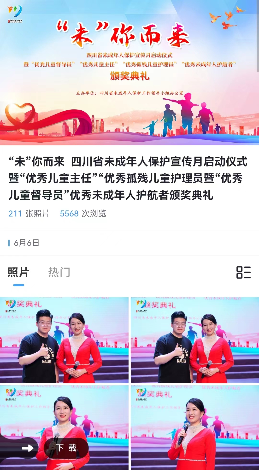 四川省未成年人保护宣传月启动仪式暨“优秀儿童督导员”“优秀儿童主任”“优秀孤残儿童护理员”“优秀未成年人护航者”颁奖典礼图片直播页面
