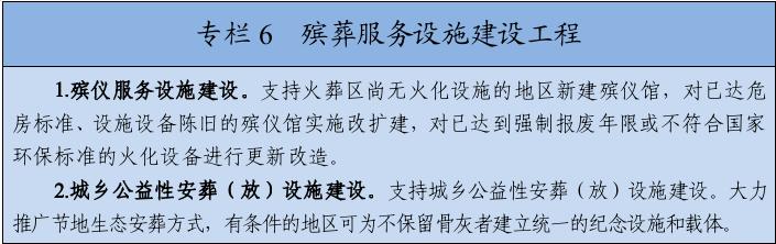 提升基本殡葬服务水平。强化基本殡葬服务公益属性,持续实施以减免或补贴遗体接运、暂存、火化、骨灰寄存等基本殡葬服务费用为主要内容的绿色惠民殡葬政策,切实履行政府兜底保障职责。落实基本殡葬服务项目清单制管理,鼓励有条件的地区提标、增项、扩面。推进殡葬服务设施规划与建设,按照覆盖城乡、布局合理、功能齐全的原则,新建、改扩建一批殡仪馆和殡仪服务站,加强城乡公益性安葬(放)设施建设,支持火化设备环保化改造,鼓励殡葬服务资源跨区域共建共享。加强殡葬信息系统建设,推动殡葬服务线上线下融合,促进殡葬数据互通共享。开展殡葬服务进社区试点,宣传殡葬政策、提供信息咨询、协助文明治丧。