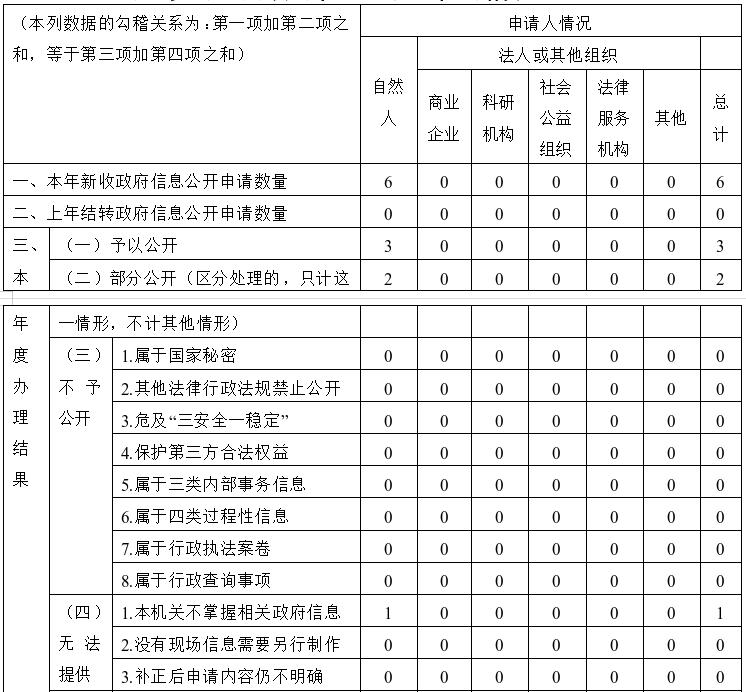 全年新收政府信息公开申请6件,全部依法依规在法定期限内予以办结。按时高质完成省政府办公厅转办的依申请公开事项。全年无被申请行政复议、被提起行政诉讼的情况。